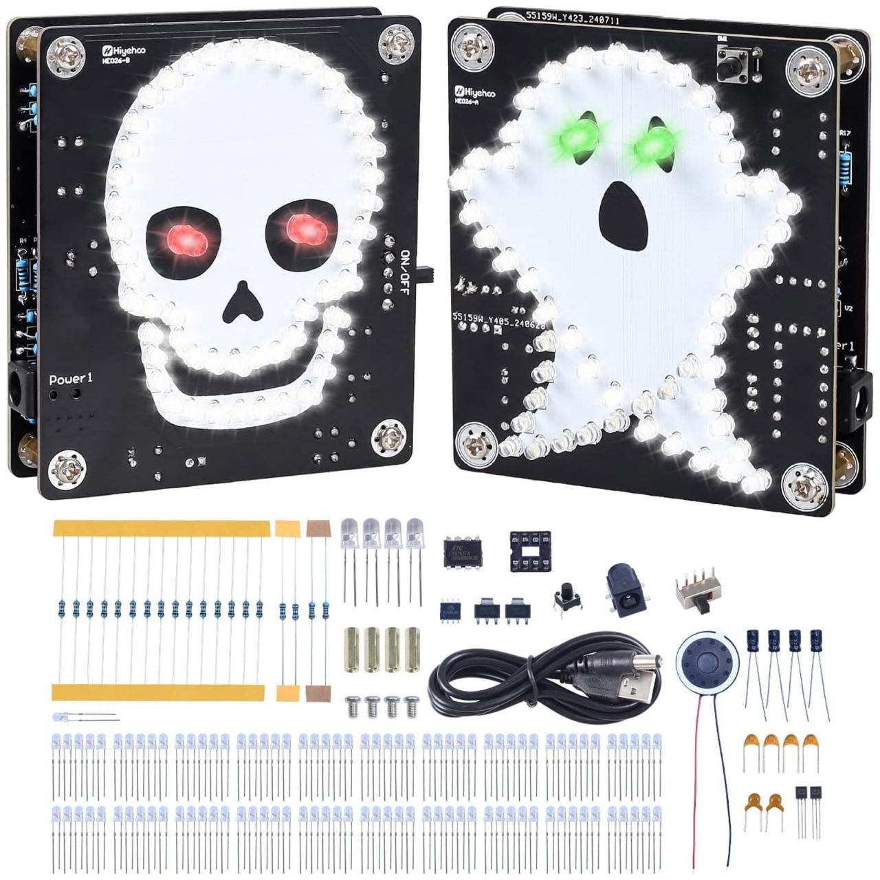 Der Bausatz enthält zwei hochwertige doppelseitig gestaltete Leiterplatten – eine mit einem Geist-Motiv, die andere mit einem Totenkopf. Beide Designs erzeugen mit flackernden LED-Augen und Soundeffekten eine stimmungsvolle Halloween-Atmosphäre.