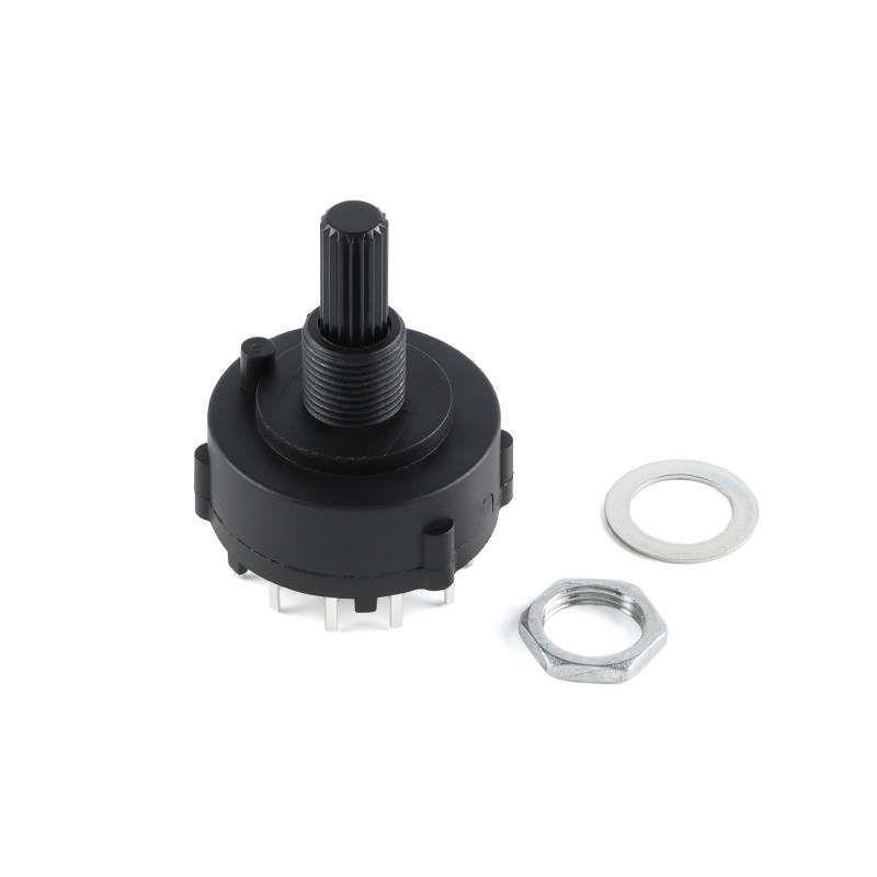 Der Drehschalter RS26 in 2 poliger Ausführung mit 6 Positionen eignet sich ideal für elektronische Steuerungen, Messgeräte und vielseitige DIY Anwendungen. Durch die Single Deck Bauweise lassen sich zwei Schaltkreise gleichzeitig und zuverlässig steuern. Der 15 mm lange Griff sorgt für eine komfortable und präzise Bedienung.