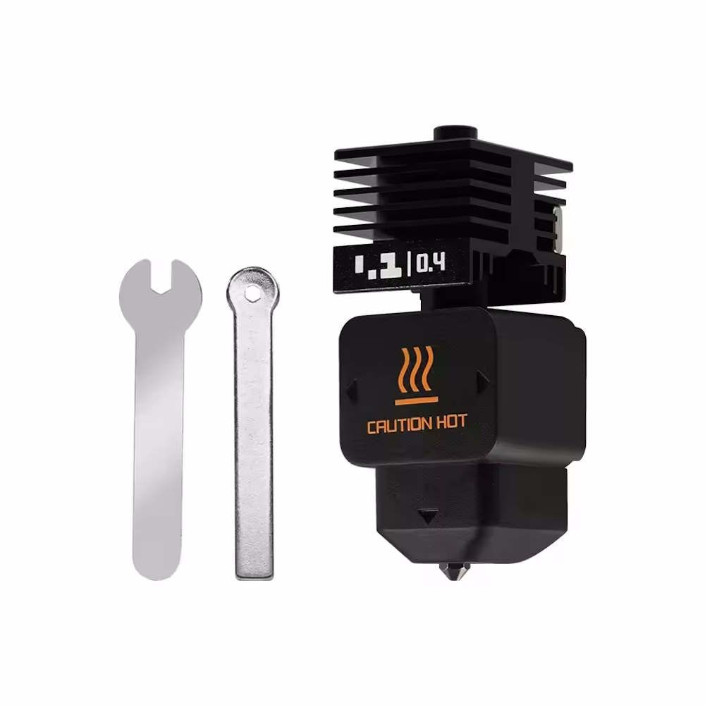 Der Heizblock aus Kupfer mit galvanischer Beschichtung sorgt für eine effiziente und gleichmäßige Wärmeverteilung. Das Heatbreak aus Titanlegierung reduziert die Wärmeleitung nach oben und unterstützt einen stabilen Filamentfluss. Die verbaute Düse aus gehärtetem Stahl eignet sich auch für abrasive Materialien und sorgt für eine lange Lebensdauer.