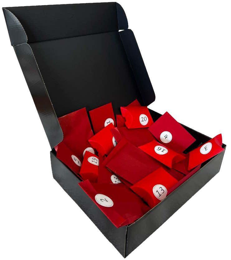 - 1x Adventskalender mit 24 Türchen in schwarzer Geschenkbox