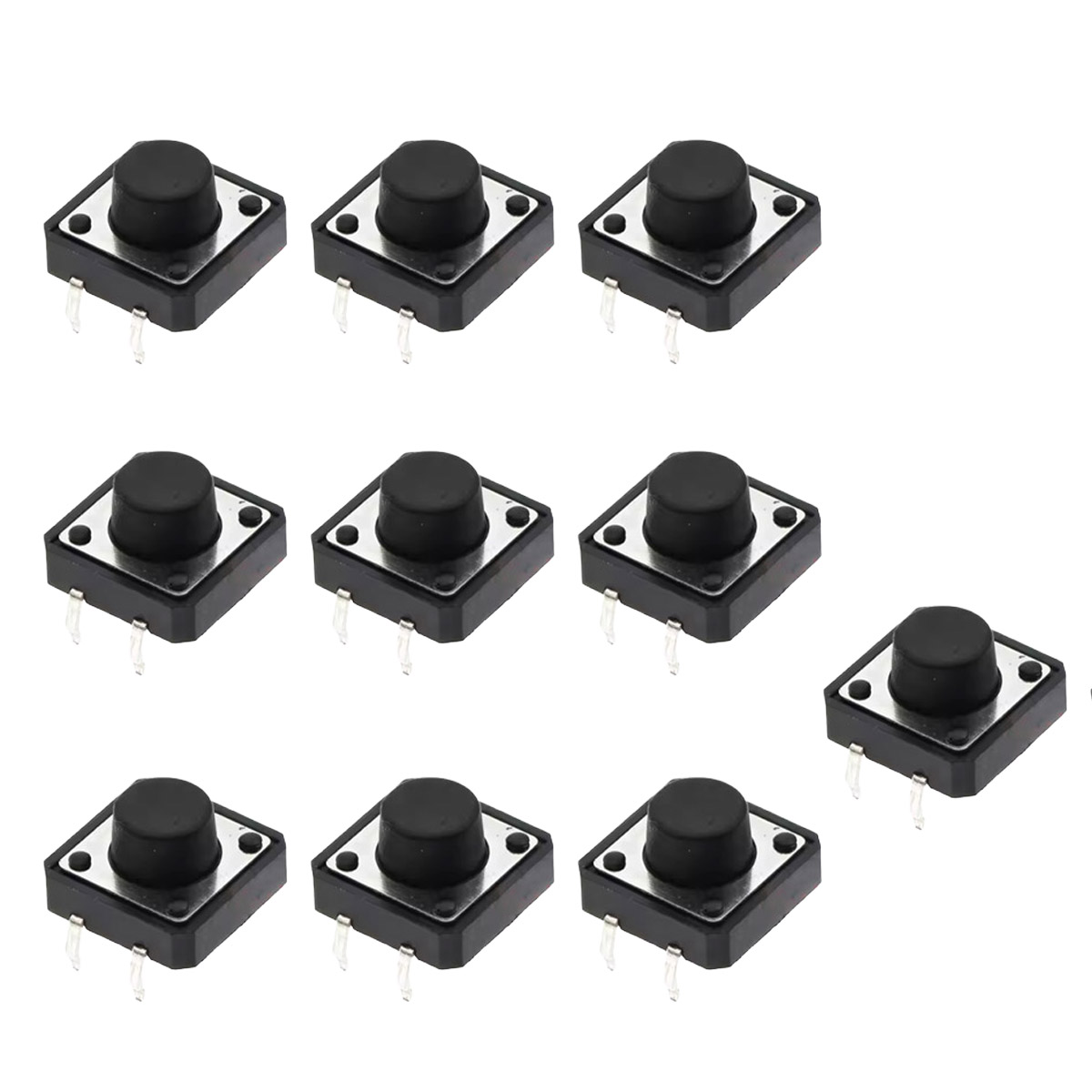 Die Taster sind als THT-Bauteile (Through-Hole Technology) ausgeführt und besitzen vier Anschlusspins im 2,54mm-Raster. Dadurch passen sie direkt in Standard-Breadboards und können auf Lochrasterplatinen verlötet werden. Das Gehäuse aus schwarzem Kunststoff misst 12×12mm, der Betätiger ragt 7mm heraus.
