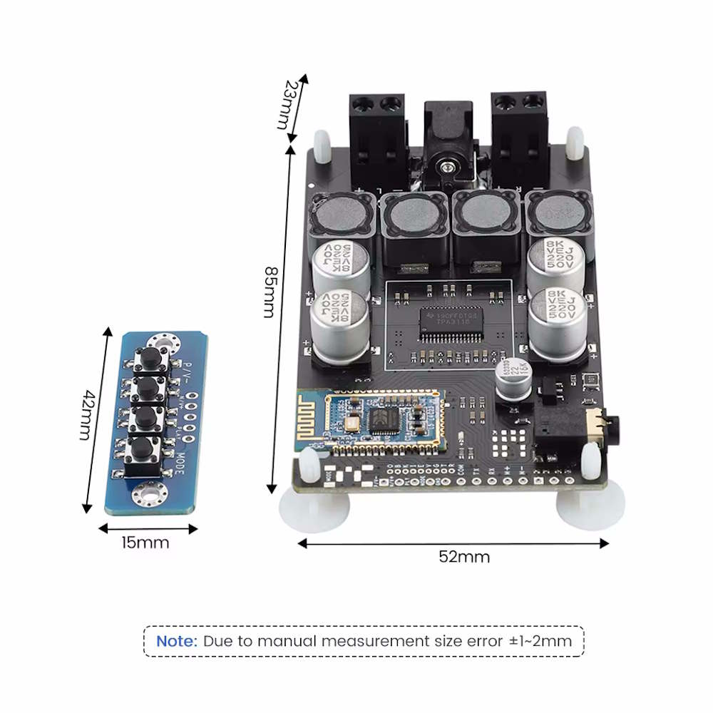 Das AIYIMA TPA3118 Bluetooth Verstärker Board ist eine kompakte und effiziente Lösung für kabellose Audioanwendungen. Mit dem integrierten TPA3118 Class D Verstärkerchip liefert das Modul eine Ausgangsleistung von bis zu 2x30 Watt und eignet sich ideal für kleinere Lautsprechersysteme, DIY Audio Projekte oder portable Anwendungen.