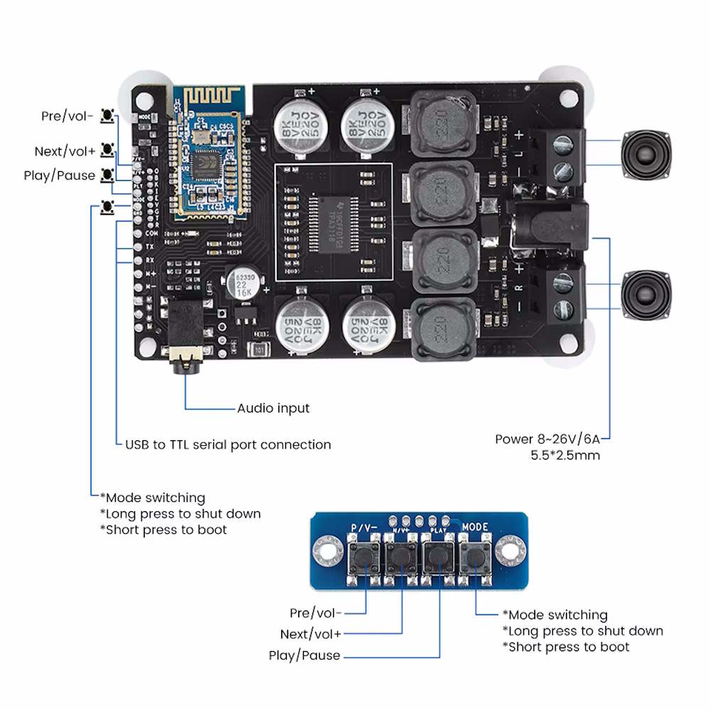 Die integrierte Bluetooth 5.0 Funktion ermöglicht eine stabile und schnelle Verbindung zu Smartphones, Tablets oder Computern. Die Steuerung erfolgt bequem über einen Taster direkt am Board oder alternativ über die serielle Schnittstelle, wodurch sich erweiterte Funktionen wie Lautstärkeregelung konfigurieren lassen.