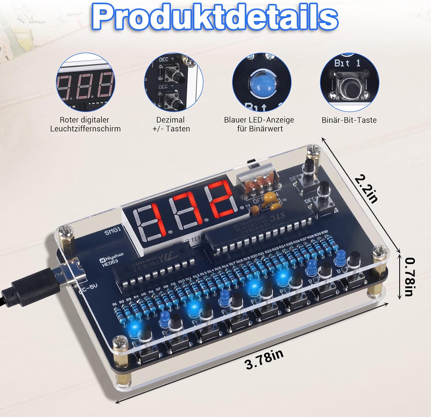 - Binäranzeige: 8 blaue LEDs