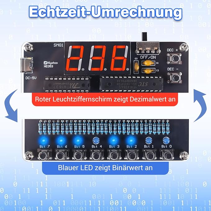 Der 8 Bit Binär-Dezimal Zähler Bausatz ermöglicht die anschauliche und praxisnahe Umwandlung zwischen Binär- und Dezimalsystem in Echtzeit. Dieser DIY Lötbausatz ist ideal für alle, die die Grundlagen der digitalen Elektronik, Informatik und Zahlensysteme verstehen und vertiefen möchten.