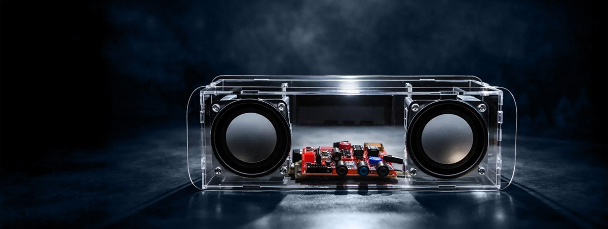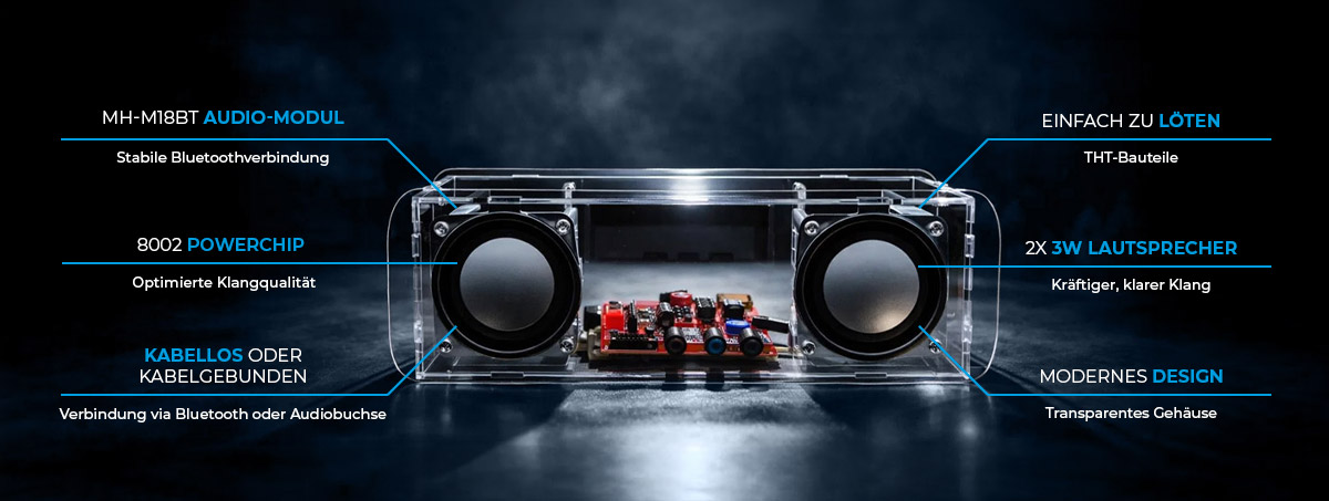 Ausgestattet mit einem leistungsstarken 3-Watt-Lautsprechern sorgt der Bausatz für eine klare und kraftvolle Klangwiedergabe. In Kombination mit dem transparenten Gehäuse wird der Klang zusätzlich optimiert und ein modernes, technisches Design hervorgehoben.