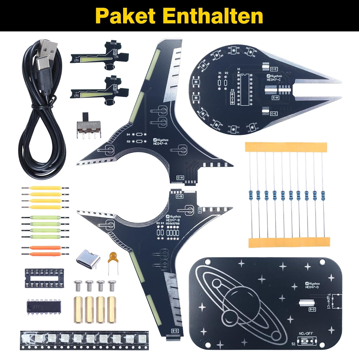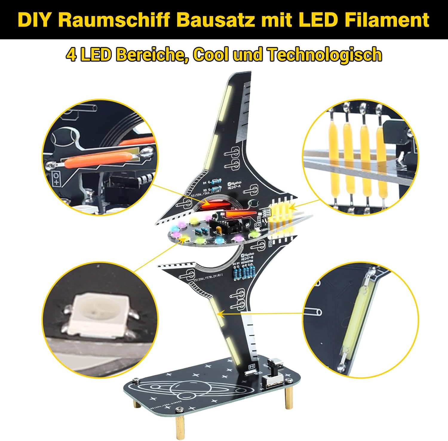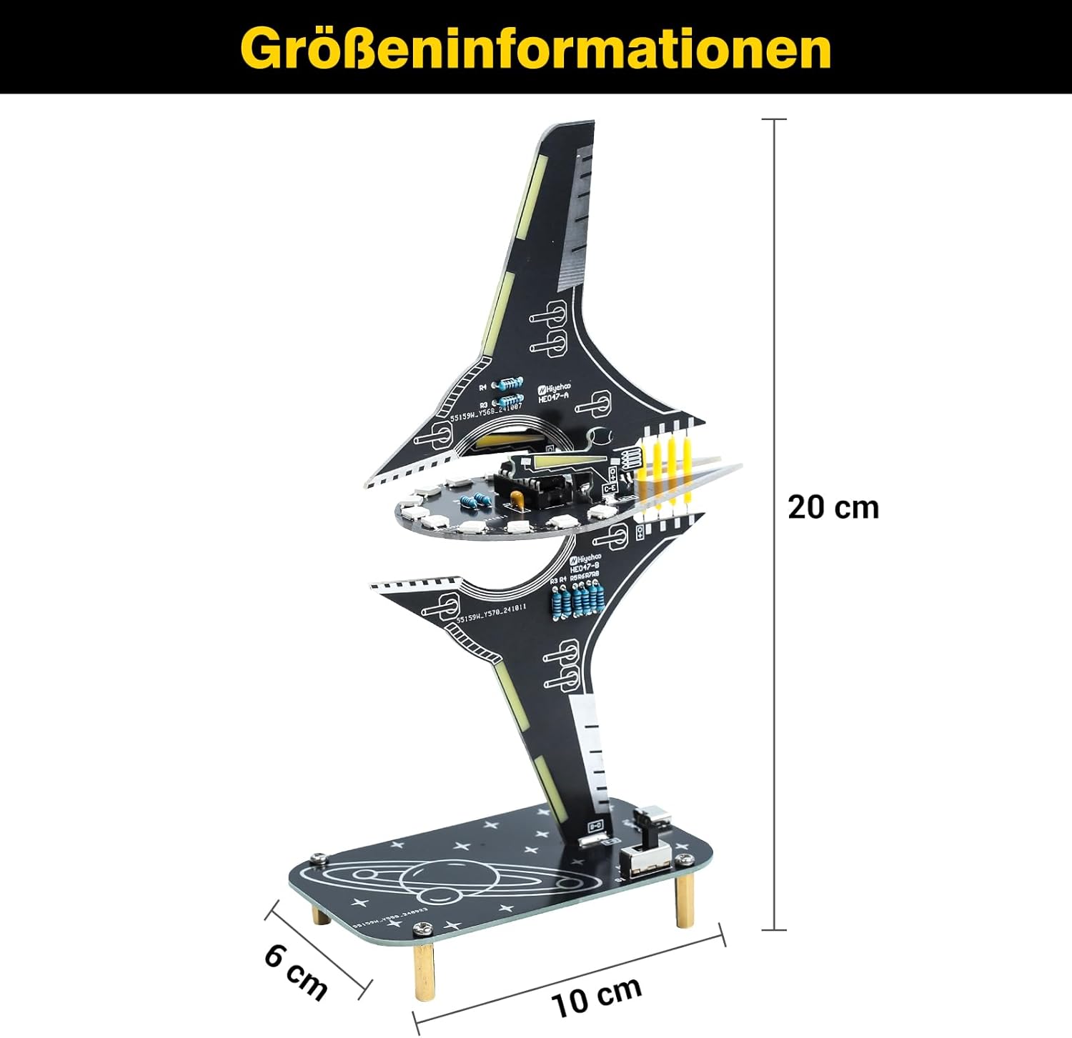 Mit seiner ineinandergreifenden Platinenstruktur (Interlaced PCB) und den leuchtstarken RGB-LEDs entsteht ein faszinierendes Mini-Raumschiff, das nicht nur Lötfertigkeiten schult, sondern auch als stilvolle Dekoration begeistert.