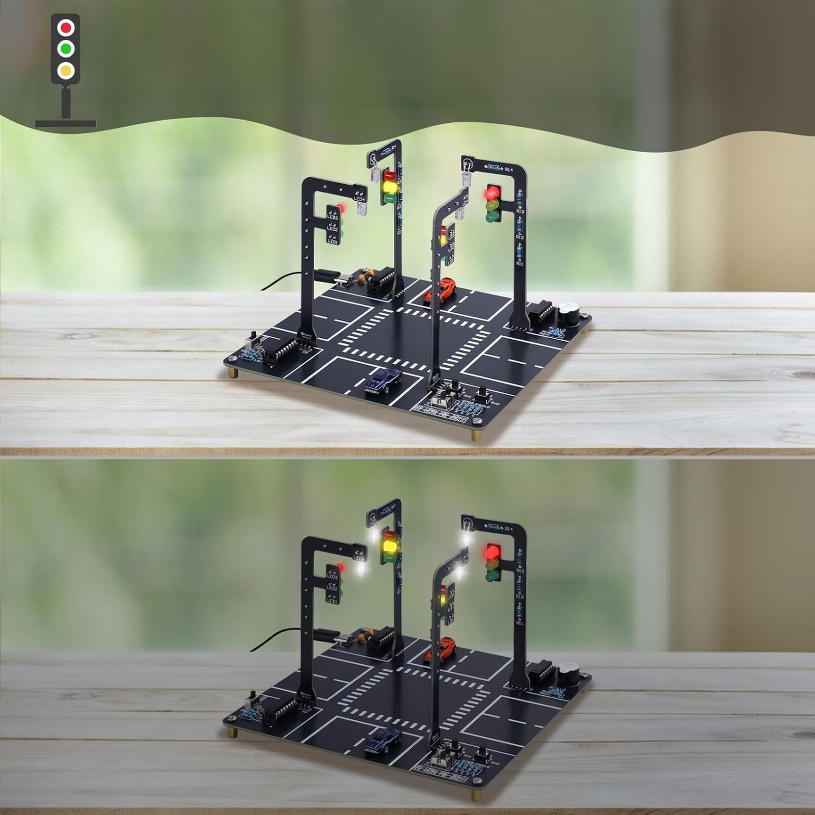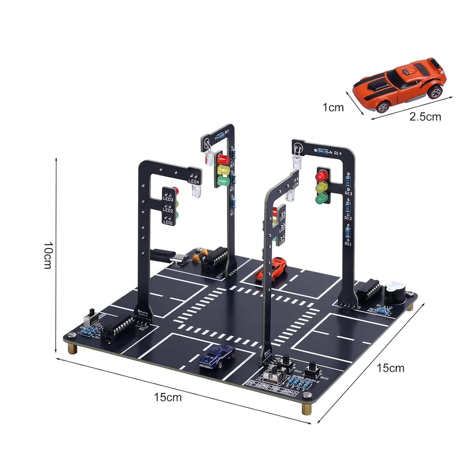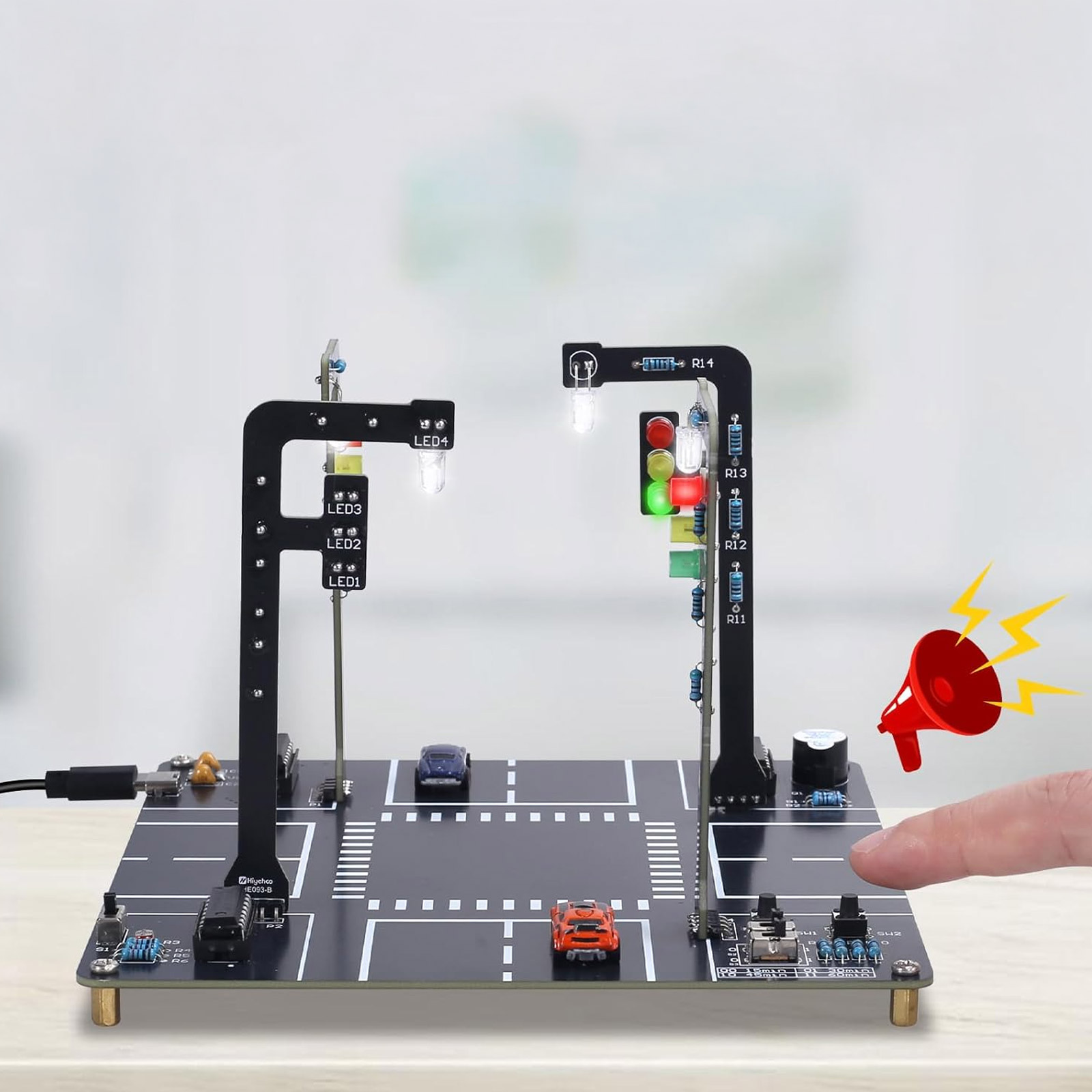Die Platine ist mit Straßen, Fahrspuren und Zebrastreifen bedruckt und wird durch enthaltene Mini Autos ergänzt. Ein integrierter Summer erzeugt akustische Signale beim Wechsel der Ampelphasen, was das Lernerlebnis zusätzlich verstärkt.