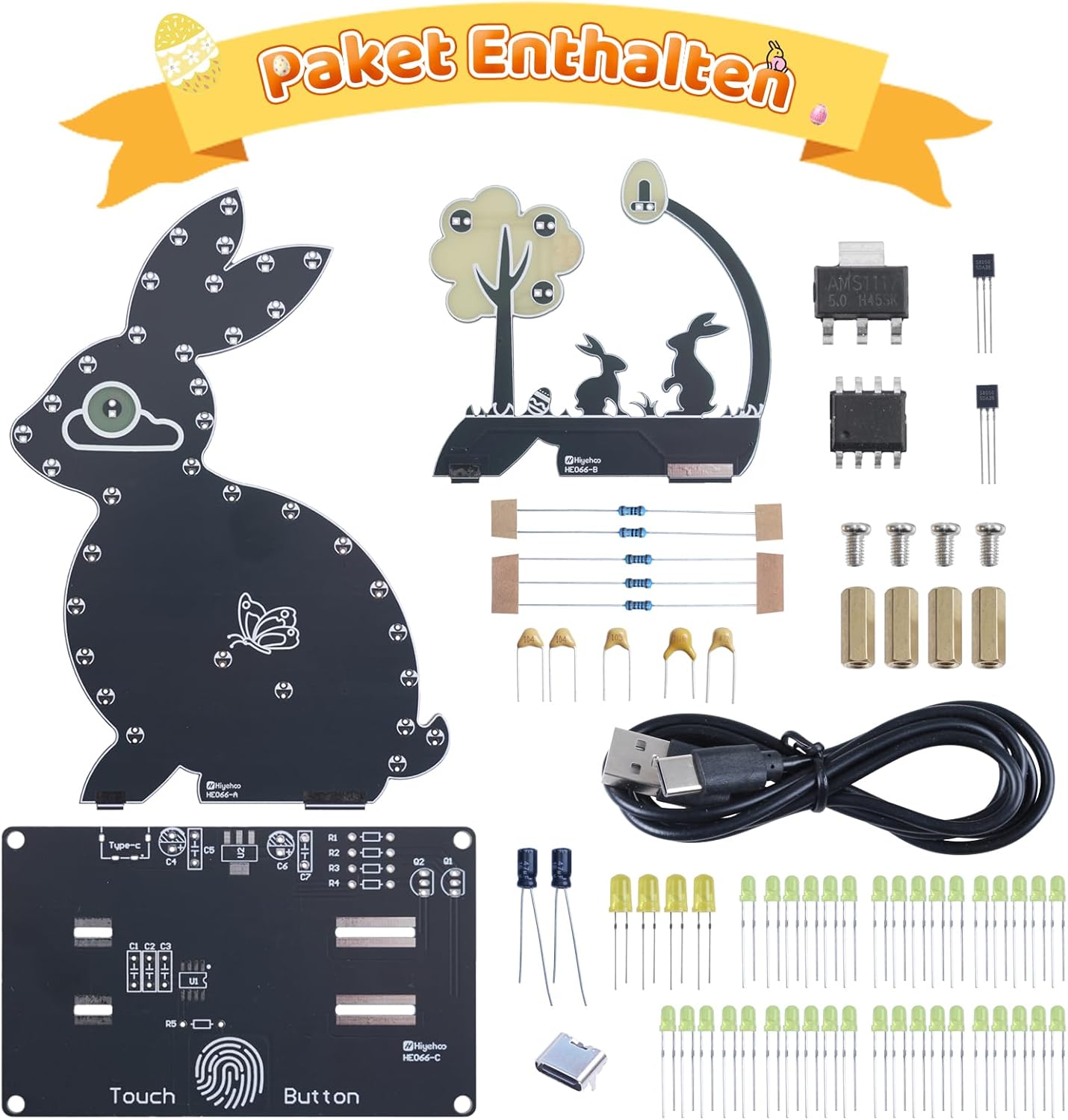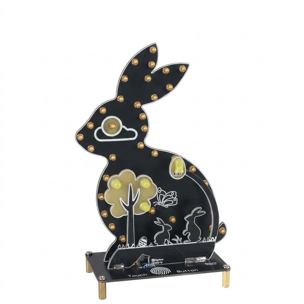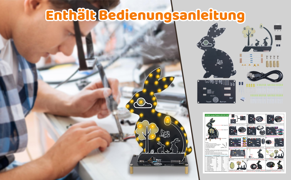 Der DIY Osterhase Nachtlicht Lötbausatz ist ein kreatives Elektronikprojekt für Einsteiger und Bastelbegeisterte. Das Set enthält alle notwendigen Komponenten wie Leiterplatte, LED-Leuchten, Widerstände, Kondensatoren, Chips und Schrauben, die Schritt für Schritt zusammengelötet werden.