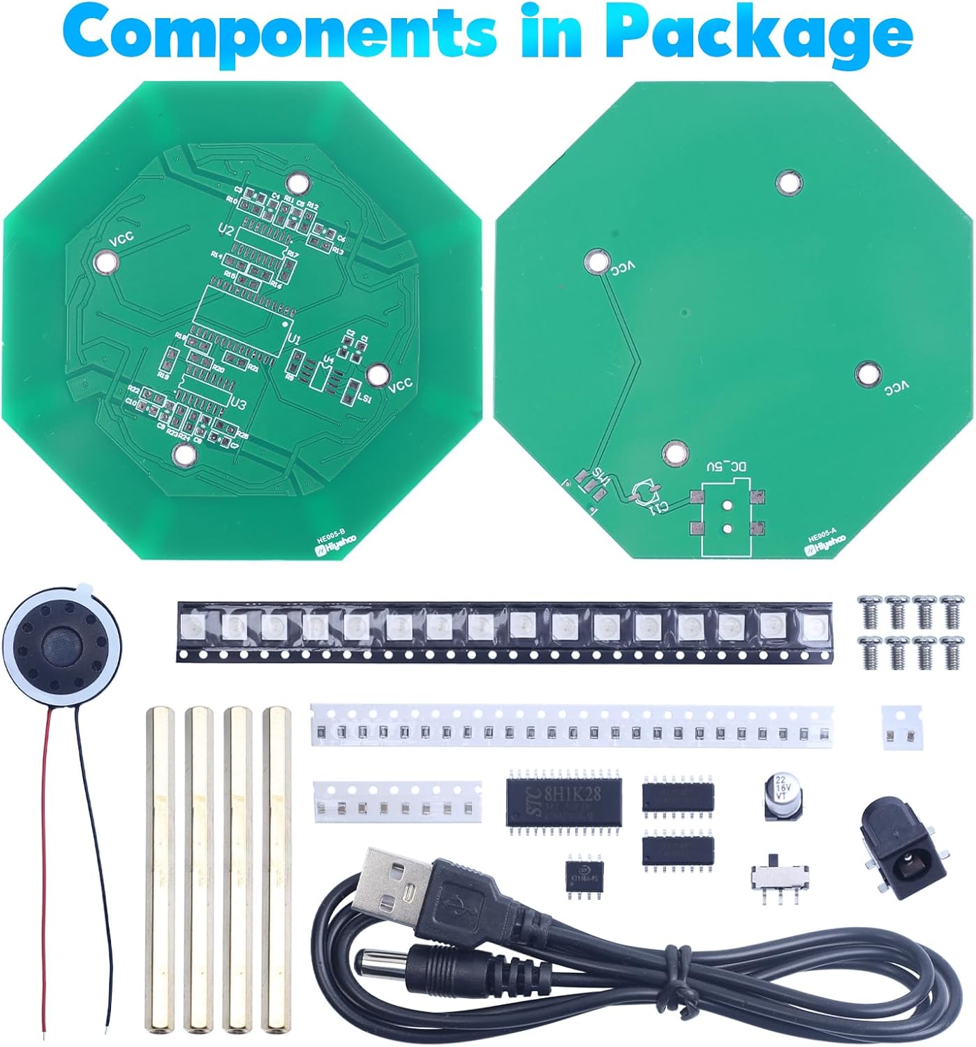 Der Bausatz besteht aus zwei Platinen, vier Kupfersäulen, acht Schrauben, sechzehn RGB-LEDs und zahlreichen weiteren Bauteilen, die Sie selbst montieren. Nach dem Aufbau entsteht eine interaktive elektronische Trommel, die sowohl optisch als auch akustisch begeistert.