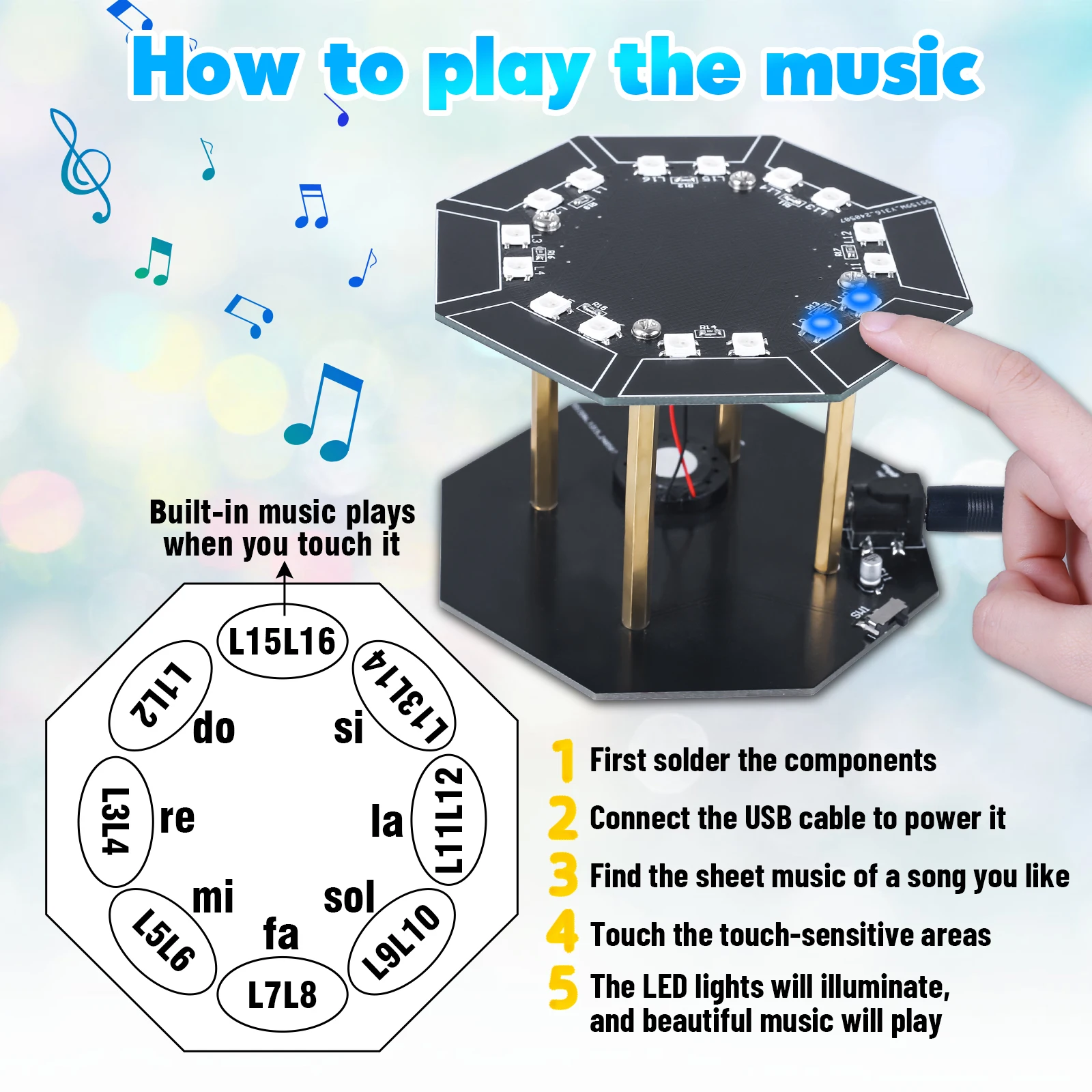 Die Trommel besitzt acht Touch-Felder – sieben erzeugen die Töne Do, Re, Mi, Fa, Sol, La, Si, während das achte Feld eine fest einprogrammierte Weihnachtsmelodie („Jingle Bells“) abspielt.