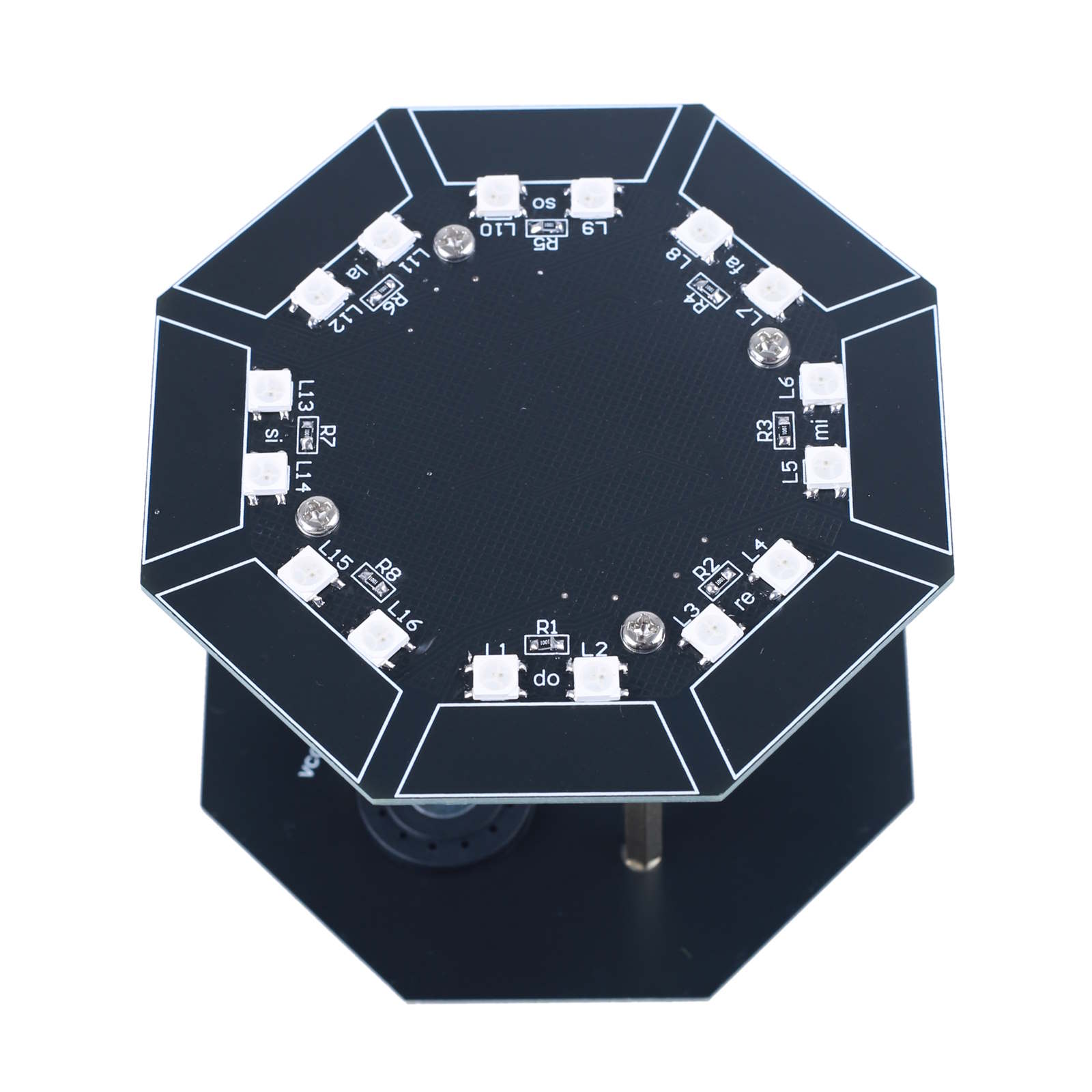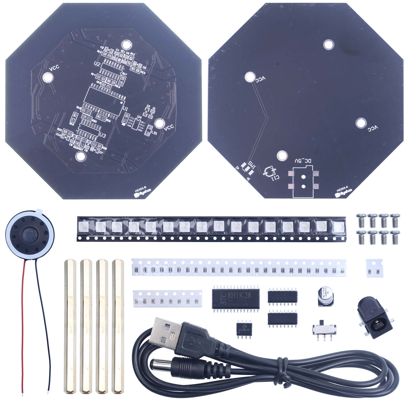 Der Bausatz besteht aus zwei Platinen, vier Kupfersäulen, acht Schrauben, sechzehn RGB-LEDs und zahlreichen weiteren Bauteilen, die Sie selbst montieren. Nach dem Aufbau entsteht eine interaktive elektronische Trommel, die sowohl optisch als auch akustisch begeistert.