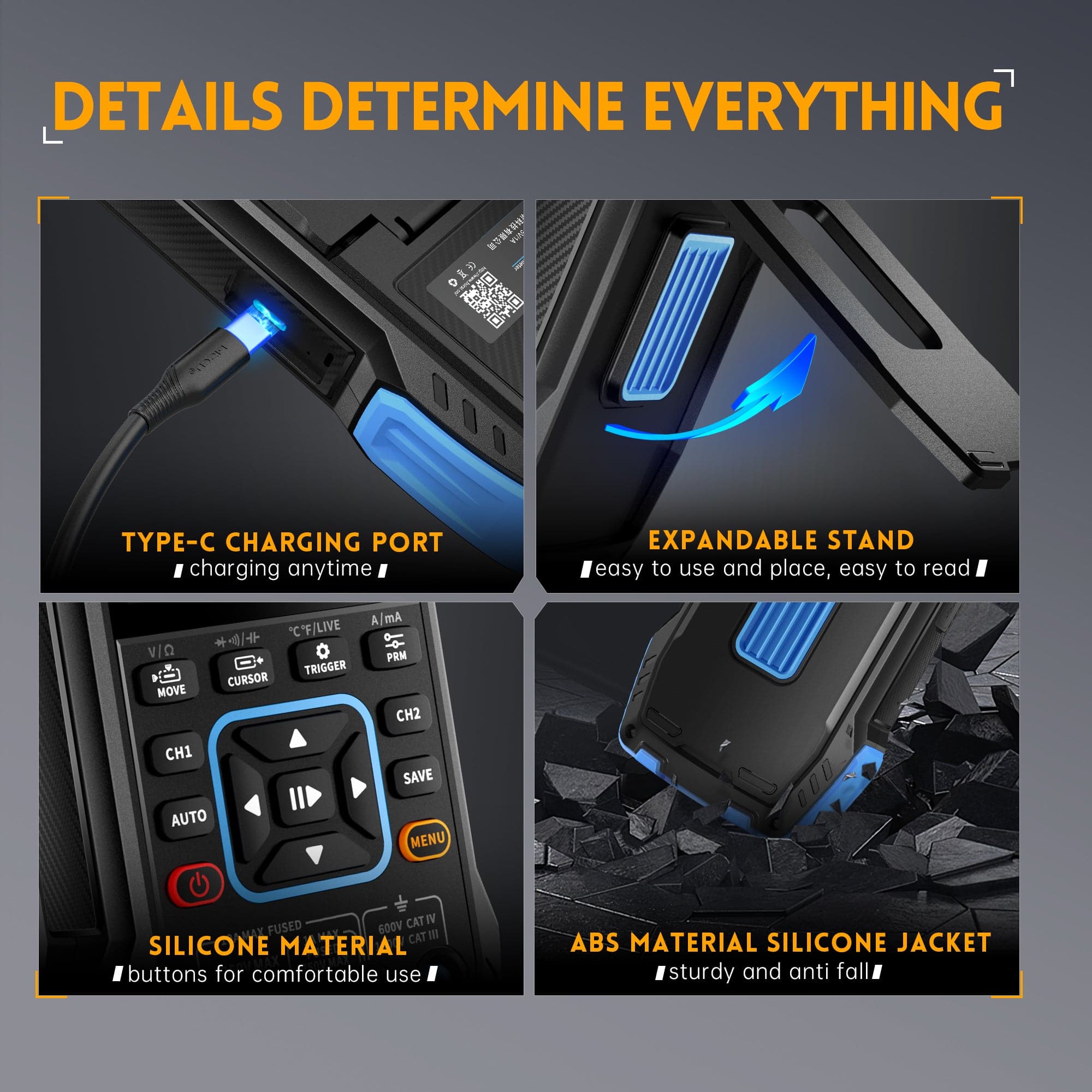 - Multimeter: AC/DC-Spannung, AC/DC-Strom, Widerstand, Kapazität, Frequenz, Diodentest, Durchgang