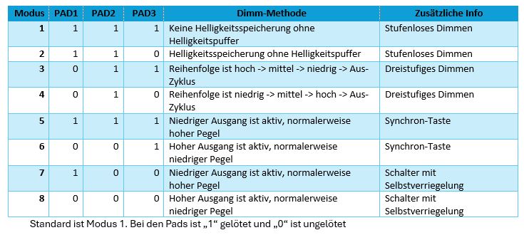 Dimmer arbeitet einwandfrei und man kann 3 Modi durch Lötbrücken wählen. Stufenloses Dimmen von Dunkel nach Hell und umgekehrt und Dimmen mit voreingestellten Stufen. Leider speichert der Dimmer nach dem Ausschalten oder nach Stromausfall nicht die zuvor eingestellte Helligkeit,