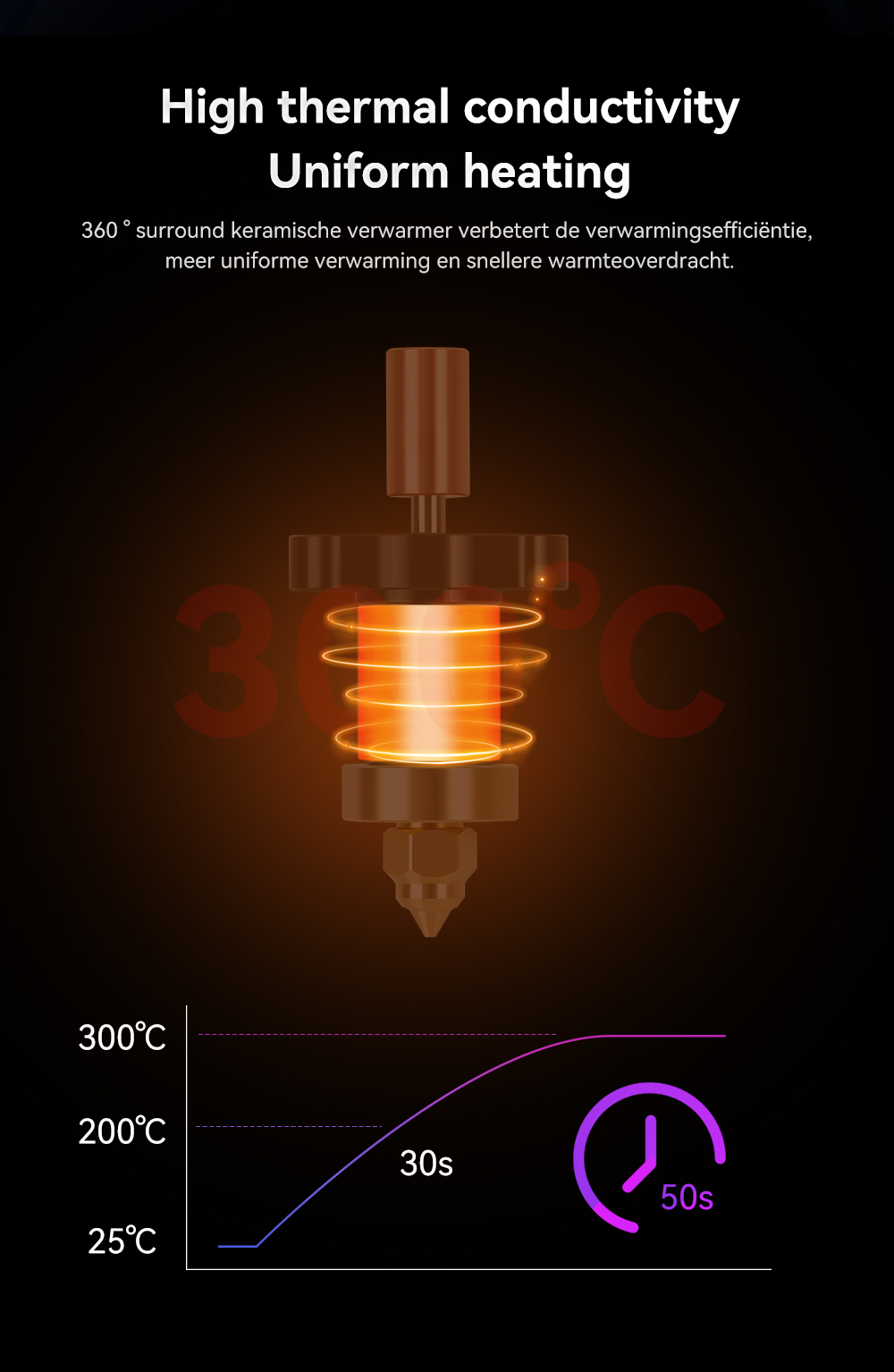 Die integrierte 60 W Keramikheizung ermöglicht ein schnelles Aufheizen und eine stabile Temperaturführung auch bei hohen Druckgeschwindigkeiten. Dadurch eignet sich das Hotend sowohl für Standardmaterialien als auch für anspruchsvolle technische Filamente. Eine gleichmäßige Extrusion und zuverlässige Druckergebnisse werden auch bei längeren Druckjobs sichergestellt.