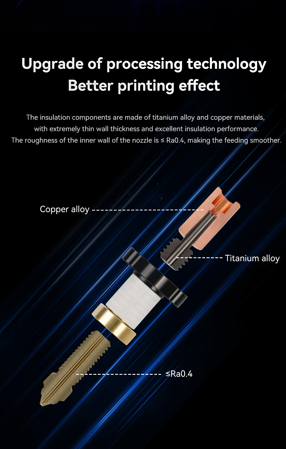 Dieses Hotend mit 0.4 mm Düse wurde speziell für die Creality Modelle K1 und K1 Max entwickelt und ermöglicht zuverlässigen Hochtemperaturdruck bis zu 300 Grad Celsius. Die Kombination aus Rotkupfer und Titanlegierung im Throat sorgt für eine optimale thermische Trennung. Während das Titan die Wärmeleitung nach oben minimiert, gewährleistet das Kupfer eine schnelle und gleichmäßige Wärmeübertragung im Heizbereich.