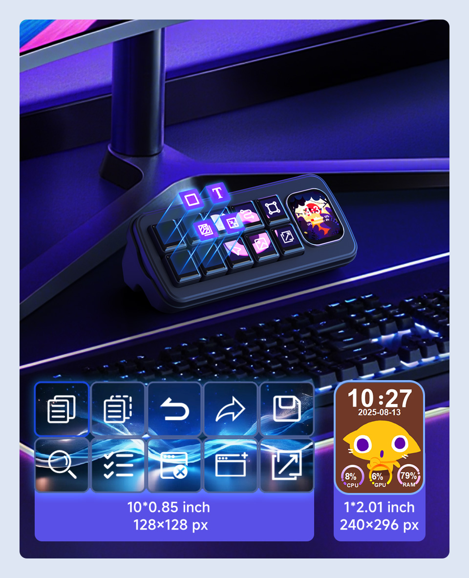Nutzen Sie das Gerät unter Windows und macOS für programmierbare Makros, complex key sequences, App-Steuerung und Mouse-Control ohne externe Software. Der integrierte Editor ermöglicht die visuelle Erstellung und Anpassung von Themes und Funktionen per Drag & Drop. Importieren oder exportieren Sie Profile, teilen Sie Einstellungen oder konfigurieren Sie benutzerdefinierte Aktionen für Produktivität, Streaming oder Smart-Home-Automationen.