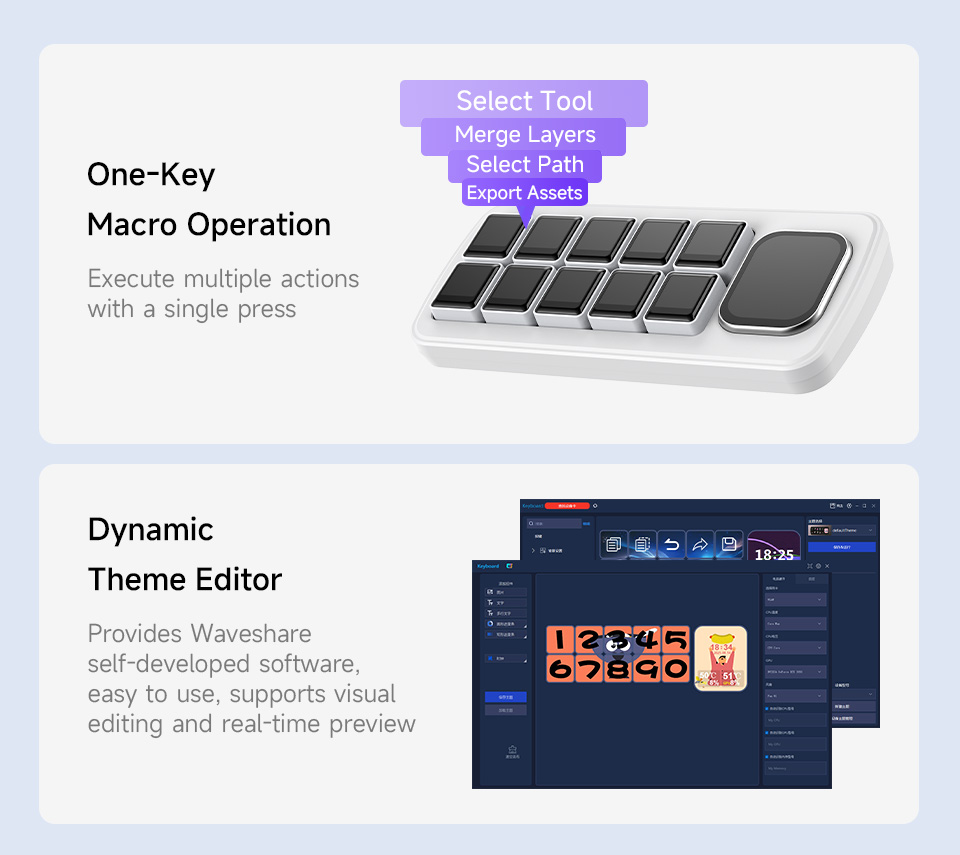 Nutzen Sie das Gerät unter Windows und macOS für programmierbare Makros, complex key sequences, App-Steuerung und Mouse-Control ohne externe Software. Der integrierte Editor ermöglicht die visuelle Erstellung und Anpassung von Themes und Funktionen per Drag & Drop. Importieren oder exportieren Sie Profile, teilen Sie Einstellungen oder konfigurieren Sie benutzerdefinierte Aktionen für Produktivität, Streaming oder Smart-Home-Automationen.