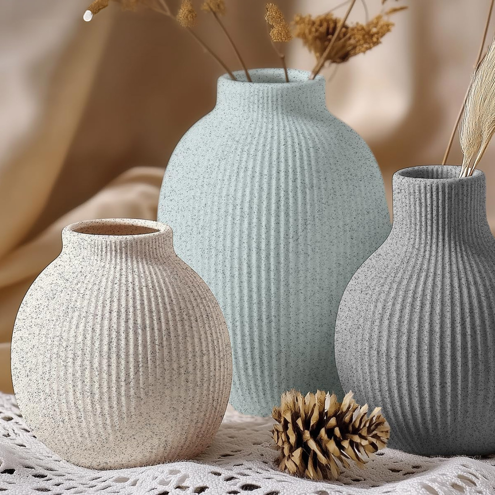 Im Vergleich zu glattem, einfarbigem PLA wirken gedruckte Objekte deutlich hochwertiger und weniger künstlich. Besonders bei größeren Flächen oder bewusst strukturierten Designs entfaltet sich die typische Betonoptik mit leicht rauer, natürlicher Anmutung.